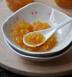 8、待溫熱後裝入乾淨、無油、無水的瓶中,再加入2勺蜂蜜。完全涼透後用保鮮膜包住瓶口,蓋上蓋兒,冰櫃冷藏放置。只要瓶子事先用開水消毒,晾乾無水,裝入果醬密封好後也不接觸水或油,冰櫃冷藏放置1個月是沒問題的。