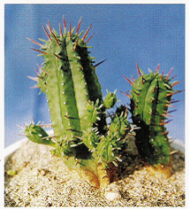 肥料:生長初期每盆施顆粒肥5~10粒,每隔7-10天施一次,進行正常的管理 。 又名火麒麟。原產南非,灌木狀肉質植物。株高1米,株幅30至40厘米。無葉,莖圓筒形,基部分枝肉質,灰綠色,6棱,棱疣排生錐形紅刺,長2至3厘米。杯狀聚傘花序,花小,黃色,苞片暗紅色。花期秋冬季。