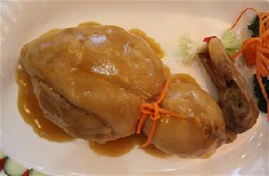 特色儋州海岸線長,占全省1/9,紅樹林資源豐富。紅樹林是淺海小生物生長的天堂。在儋州的紅樹林下飼養的鹹水鴨,以紅樹林下的小魚小蝦及紅樹林果子為食;肉質地結實骨硬而香,是儋州一大固有特產。此菜造型美觀,味道濃香,吃而不膩。製作方法1、用姜、蔥、酒把鴨皮洗淨去腥味,然後用清水洗乾淨待用;2、將以上糯米等原料和調料放入鴨腹中,用開水加老抽正水至金黃色,再用繩子綁鴨造葫蘆型放入鴨腹中蒸1小時熟即可。
