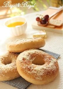 10)煮好的麵團用漏勺撈起,發酵時衝上的一面,依然衝上擺放。稍微涼一些沾上芝麻或帕梅善起士粉或是不沾做成原味貝果. 放進已經預熱至190度c的烤箱中烘烤12-15分鐘至金黃色即可。