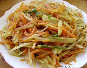 素炒雙絲,美食,原料有胡蘿蔔2根,土豆2個,色拉油30克,精鹽3克,五香粉2克,味素3克,白醋10克,生抽少許。記得最後加入味素調味,翻炒均勻,出鍋,裝入盤中即可。