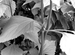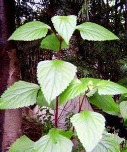 植株莖呈紫色,上有細細絨毛,散發淡淡的腥味紫莖澤蘭,莖直立,高30~90cm,分枝對生,斜上,全部莖枝被白色或銹色短柔毛。葉對生,葉片質薄,卵形、略三角狀或菱形,基部平截或稍心形,頂端急尖;邊緣有粗大圓鋸齒,花序下方的葉為波狀淺齒緣或近全緣;葉面綠色,葉背色淺,兩面均被稀疏短柔毛,葉背及沿葉脈處毛稍密,基出三脈,葉柄長約4~5 cm。