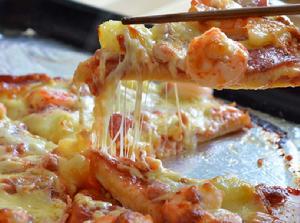 6、在麵餅上依次塗上番茄醬;撒上大約70g乳酪;鋪一層義大利辣腸;均勻地鋪一層蝦;撒上一點鳳梨塊;再撒上約70g乳酪。