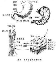 胃[漢字]哺乳類的胃壁一般由 3層組織構成,內層是黏膜層,外層是漿膜層,中間是由平滑肌組成的肌層(圖1)。肌層因肌纖維走向不同而分為斜行、環行和縱行3層。胃黏膜的結構比較複雜,大部分胃黏膜都有胃腺,但也有不含胃腺的,例如,鼠類的胃分為前後兩部,前部叫前胃,不含胃腺,後部叫腺胃,含有胃腺。反芻類的復胃中,僅皺胃有胃腺,其餘3個胃都不含胃腺。不含胃腺的胃黏膜由復層鱗狀上皮覆蓋,含胃腺的黏膜則由單層柱狀上皮覆蓋。