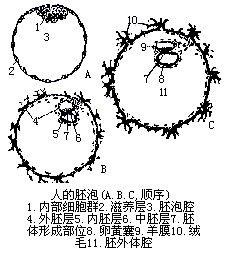 胚泡:桑椹胚的細胞在子宮腔內繼續分裂,細胞數目不斷增多,發育到第5天時已有100多個細胞,這時細胞重新排列成泡狀,稱胚泡或囊胚。胚泡由三部分構成即①滋養層②胚泡腔③內細胞群。在哺乳類發生早期,稱卵裂期終了的胚胎為胚泡。哺乳類的卵為無黃卵,進行完全卵裂而形成卵裂球的團塊,不久在團塊內部生出空腔,逐漸擴大,最後成為由一層細胞圍成的泡狀體,並從壁的一側有一細胞團塊向內腔突出,這樣的泡狀體就是胚泡。