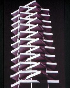 另一個每層是方形,用四十五度相重疊,從底層仰望,因透視觀系的呈現寶塔造形 ,從私密性來講,主要的觀念是,電梯停留的空間是在兩層之間,居住者需上半層樓,或是下半層樓,才能到達他們居住的那層,因此在兩層之間,就有了保密性。 又整層樓的電梯可減少一半的停留點。