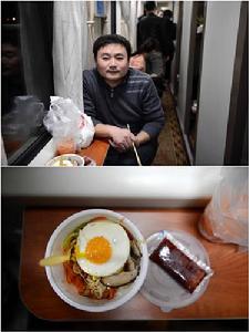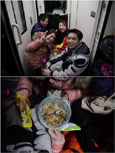 王先生在北京從事IT業工作已將近20年,他的晚餐是一份上車前買的快餐,價格為25元。在過年回家的途中,舌尖上的美味各不相同。記者在北京至井岡山的列車上看到,有的