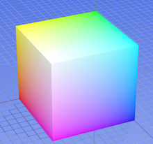 色光三原色RGB顏色模型映射到一個立方體上。水平的x軸代表紅色,向左增加。y軸代表藍色,向右下方向增加。豎直