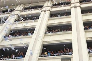 撕書2016年5月26日晚,福建晉江季延中學教學樓下的石板路上聚集了高一、高二年級的1200多名學生,他們仰起頭,向三、四、五樓的高三年級學長學姐送上大聲的祝福——“揚帆起航,乘風破浪,季延學子,再創輝煌”。“喊樓”是季延中學的一項傳統活動,至2016年已開展了6年。除了正經的加油助威,還有“某某學長我愛你,明年北大去追你!”“苦過累過,高考必過”這類口號。
