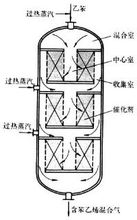 乙苯脫氫反應器有等溫和絕熱兩種。等溫反應器為列管式,已很少採用。使用絕熱反應器時,反應所需的熱量由提高進料溫度(610~660℃)和加大水比(≈14)而帶入。但溫度過高將引起乙苯的熱裂解,通常採用徑向反應器,以減小氣體通過催化劑層的溫度降、壓力降,並分段引入過熱蒸汽,使軸向溫度分布均勻。