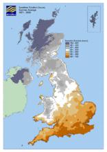 英國氣候圖英國屬溫帶海洋性氣候。英國受盛行西風控制,全年溫和濕潤,四季寒暑變化不大。植被是溫帶落葉闊葉林帶。通常最高氣溫不超過32℃,最低氣溫不低於-10℃,平均氣溫1月4~7℃,7月13~17℃。年平均降水量約1000毫米。北部和西部山區的年降水量超過2000毫米,中部和東部則少於800毫米。每年二月至三月最為乾燥,十月至來年一月最為濕潤。英國終年受西風和海洋的影響,全年氣候溫和濕潤,適合植物生長。英國雖然氣候溫和,但天氣多變。一日之內,時晴時雨。
