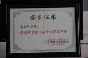 2011年4月由中華醫藥衛生學會,北京中天道源國際醫藥學會科學研究院頒發的“新世紀中華十大國醫聖手“榮譽證書”。
