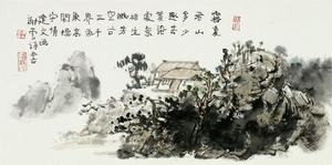 板子上的那些畫令我注目,那儲藏在畫家山水、人物作品裡的色彩和線條,蘊藏在筆情墨趣中多有某種[獨白]之訴,是畫家本人[獨坐畫齋]面對面的情景交流。眼前尚未裝框的那些畫既無華麗渲染,更無矯揉造作,看得出作者是一位力避塵囂,蓄意追尋自己心中的純淨與安詳。尤其是莫君的山水,使我聯想到蘇東坡的兩句禪詩:[溪聲便廣長古,山色豈非清淨身]。記得曾在某個刊物上見過莫君早年的一幅取名《落照歸鈴》的山水畫,其蓊鬱繁密、層巒疊翠的藝術效果,很有山水大家黃秋原的味道。