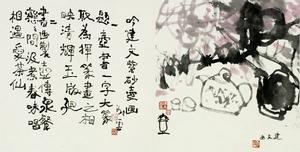 作品色耶象耶,紫砂壺東倒西歪,蒼蒼莽莽,雅筆間掩映襯託了我的一點茶趣幽情,揮之;吟建文紫砂壺畫: