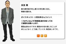 | 美里薰(美里 薫(みさと かおる)) 聲優: 小西克幸 農大農學部二年級生,住在學校宿舍內,喜歡喝酒。 | |