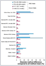 還需要特別注意的是:對同一樣本採用不同生產廠家檢測獲得的數值之間的差異在一部分上是檢測各種葉酸形式的能力和使用的校準品類型造成的。圖2表示的是來自美國病理學會能力調查的血清和RBC葉酸結果。圖表中表現出的巨大差異極可能是由抗體對不同廠家使用的抗原(谷氨酸)差異所造成的。葉酸檢測還沒有實現標準化,不過使用通用的參考標準能夠降低檢測之間的差異。正因如此,謹慎對來自不同實驗室和發表研究的葉酸結果進行解釋是及其重要的。