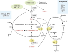 4)藥物干擾。通過一碳方式進行新陳代謝並用於治療癌症的藥物,如甲氨蝶呤和5-氟尿嘧啶,可能會導致功能性葉酸缺乏的結果。原因是,這些藥物能抑制葉酸通道中的關鍵酶,如甲氨蝶呤抑制二氫葉酸還原酶(DHFR),5-氟尿嘧啶抑制胸苷酸合成酶(TS)。葉酸吸收降低也能發生類似二甲雙弧、消膽胺、抗痙攣藥和H2阻斷劑等藥物中,但這些都是在飲食葉酸攝入量較低的情況下發生的。