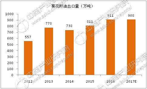 中商產業研究院發布的《2017年全球葵花籽油市場研究報告》指出,全球葵花籽油的出口量總體上增長較快,2012到2016年全球葵花籽油出口量的年均複合增長率為13.09%。2016年,全球葵花籽油出口量超過900萬噸。