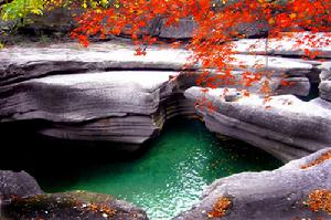 更令人驚嘆的是位於十八潭之首的“潛龍”。在水深僅一兩米的龍池中,一塊斜立水中的巨石下,一條巨大的龍身赫然在目。龍身圓潤,有尺余粗,長約七八米,如透雕一般下部鏤空,曲線流暢,龍腳清晰,鱗甲皆現;身尾自然盤曲,龍頭被巨石鎮壓,因此稱巨石為“鎮龍石”。在陽光與水波中,巨龍恍然預動,活靈活現,使大自然塑造的石龍充滿了神奇的魅力。瀑布跌水景觀