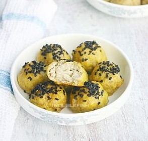 用自己喜歡的方法整成圓形丸子狀,一半的肉丸表面塗蛋液撒上黑芝麻,