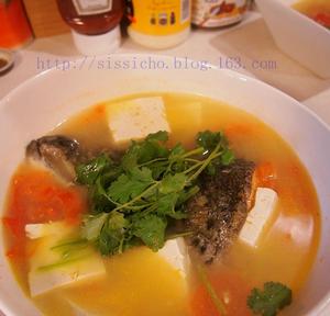 1.魚頭洗淨去魚磷和腮,瀝乾水份備用;2.嫩豆腐切片,比平時稍微厚一點焯水,焯水時記得放少少鹽下去,這樣豆腐在煮時才不會爛.蕃茄切片,姜切片,香菜切成斷備用;