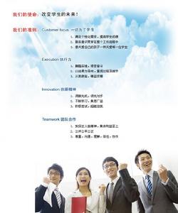 我們的使命:改變學生的未來! 我們的準則:Customer focus 一切為了學生 1、滿足個性化需求,提高學生成績 2、服務意識貫穿整個工作流程中 3、像關愛自己孩子一樣關愛每一個學生