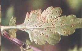 和Puccinia horiana P.Henn稱堀柄銹及Phakopsora artemisiae Hirat.稱篙層鏽菌,均屬擔子菌亞門真菌。Puccinia chrysanthemi夏孢子堆褐色,多生於葉背,少數生在莖上,大小l一2mm;夏孢子黃褐色,球形至橢圓形,具刺,大小30—37×25—32(μm),具3個芽孔,上生突起。冬孢子堆生在葉背或葉柄和莖上,大小l一2mm,深褐色或黑色;冬孢子栗褐色,倒卵形至橢圓形,大小38—55×23—32(μm)。P.horiana冬孢子堆黃褐色葉背生,大小2—5mm;冬孢子黃褐色,長橢圓形至紡錘形或棍棒狀,大小30一52×11—17(μm),分隔處稍縊縮,基部狹窄,平滑,柄淺黃或無色,柄長50μm,不脫落。Phakopsora artemisiae夏孢子堆多生在葉面表皮下,後期才開裂;側絲棍棒形,直或彎,無色至.近無色,長38—41.5μm;夏孢子淺黃色,卵形至橢圓形,具短刺,芽孔不明顯。