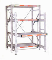 後推式貨架後推式貨架也稱壓入式貨架,將軌道安放在普通托盤貨架上面,通過調節橫樑的安裝位置的不同使軌道產生一定是斜度,將托盤小車通過軸承跨於軌道上,在托盤小車及貨物的重力作用下,當前端貨物被取走 時,後面的托盤小車將自動向前滑動。該類貨架只需要極少的叉車通道,能極大的提高倉庫空間的利用率。