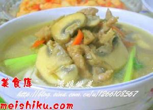 3、鍋內下少許油,肉絲下鍋劃開,變色盛出,再下蘑菇煸炒,倒入肉絲,加一點生抽、胡椒粉,再加入一點高湯,稍煮盛出備用。