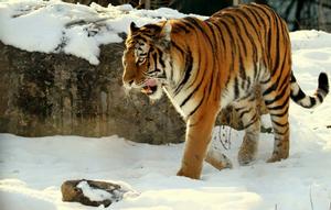 東北虎東北虎(Panthera tigris altaica,又名西伯利亞虎)長達11英呎(約158~225cm),重達450磅(雄性體重達180~207kg,雌性體重100~167kg),是現今體型最大的貓科之一,第二大虎亞種。體毛較長而密,體色較淡;身體上黑色斑紋疏。腹部的白色延伸到身體兩肋部。分布於俄羅斯東南西北利亞、朝鮮及中國東北小興安嶺和長白山一帶。它們在從前被稱為神,現在卻加上了惡魔的雙重意義。西伯利亞虎的條紋顏色較淡,腹部白毛較多,方便它們在雪地中潛行,埋伏可長達半小時,由於棲息地被破壞及盜獵猖獗,使得西伯利亞虎的數量銳減。