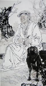 《草原初秋時》,藏族姑娘,凝眸,顧盼,神遊物外。《泥工江偉才》,健碩老人,愁悶,若有所思。前者可參“生存之艱難”,後者可追“信仰之神秘”;姑娘之衣飾,質感細膩,層次豐富;老人之筋骨,肌理粗獷,飽經滄桑。兩畫相對照,皆有厚重感:入木三分,得精氣神。在此,不妨大放厥詞:袁氏人物畫,此等稱上品。何以見得?源於生活乎,有似親戚哉。
