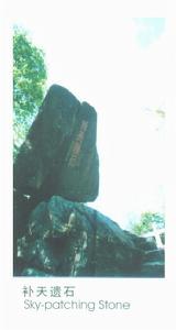 九宮山有一巨石透空聳立,兩側底部空懸,只有中部的一個支撐點,穩固地置於石座之上,更顯得奇異非凡。傳說女媧補天之時,