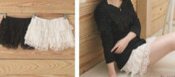 常用來作為打底用,配合長款上衣,拉長腿部效果,又不會因為太短而走光,深受年輕女生的喜愛,質地較輕,基本由紡紗加蕾絲花邊組成。