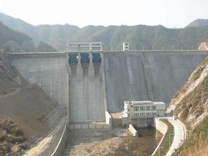 西溪水庫為多年調節水庫,是一座以防洪、供水為主,兼顧灌溉、發電的綜合利用工程。水庫庫容0.85億m3。 本工程樞紐建築物主要由碾壓混凝土重力壩、壩後式廠房及廠房開關站等建築物組成。碾壓混凝土重力壩壩頂長為265m,最大壩高71m;壩頂布置有三孔溢洪道,每孔淨寬10m;壩內引水鋼管布置在⑥號壩段,管徑1.8m;發電廠房尺寸為