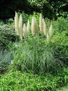 大型常綠植物,株形圓整,葉片頎長。圓錐花序大,雌花穗銀白色,具光澤,小穗軸節處密生絹絲狀毛,小穗由2~3花組成。雄穗為寬塔形,疏弱。花期9~10月。矮蒲葦用於庭院栽培壯觀而雅致,或植於岸邊入秋賞其銀白色羽狀穗的圓錐花序。也可用作乾花,或花境觀賞草專類園內使用,具有優良的生態適應性和觀賞價值。