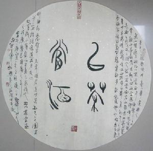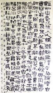 任何一門藝術都是以這兩個層面的形式存在的,包括中國的書法藝術。幾千年來的書法藝術發展史為中國這一本土文化培養了世世代代的客群,傳統的書法藝術幾乎就是一種大眾藝術。然而,時代發展到今天,各種藝術思想達到了空前的進步和解放,書法藝術受前衛藝術思想的影響和世界文化的影響,也進入了一個極其繁榮、進化的時期。在這一時期,傳統書法受到了挑戰:書法藝術家已經不再滿足於循規蹈矩的步古人後塵、拾古人的牙慧,這是一個追求個性的書法時代、是一個追求個性解放的時代。因此,一些具有前衛思想的書法家開始在繼承傳統書法優秀技法、表現方式的基礎上,在走自己的路:諸如線條的質感的更加抽象與奇異、結體更加奇詭和恣肆、取法更加寬泛和兼容、表現語言更加豐富和不拘常法等等。在這種格局下,最早受日本少字數流派和書畫同源的啟示,中國現代書法的一個新流派"現代書法"開始萌芽,經過十幾年的躑躅發展,湧現了一批優秀的現代書法創作者,創作了一批較為成功的現代書法作品。在眾多的現代書法創作群中,許傳峰作為現代隸書書法創作的成功書法家,表現了其獨有的睿智和前衛的思維。曾幾次以其現代隸書書法作品在具有中國當代書法最具探索性、嘗試性的全國中青年書法展中獲高獎,顯現了許傳峰在現代隸書書法上的成功探索。許傳峰最近參展的這組新作,是他現代書法的又一優秀作品。許傳峰的現代隸書書法大體分三種:一種是具有現代創作表現語言的傳統風格書法,用許傳峰自己的話叫"傳統情結";一種是字數多的現代書法,書寫內容多以詞語或詩句為主,如幾屆中青展獲獎作品;另一種是多體字作品,這種作品更加刻意注重對某個字的結體造型、構圖、線條、墨法、墨象進行塑造和在創作,目的是通過以文字為載體表現具象與抽象的完美結合來表現文字本身所具有的意境與內涵,創作追求是一種情景的表現,用最少的文字載體表現更加模糊和更加複雜更加深邃的思想以及內心情結或思想。許傳峰的這這種作品就屬於他的第三種風格的現代書法作品。這件作品吸取了篆刻和繪畫上的構圖法則,作品的四邊經過精心謀劃被撐得滿滿的,這本身就具有很濃的現代藝術性,打破了傳統書法四邊留空的慣用手法,構圖飽滿嚴密。但從整個構圖講,上邊兩個角和下框線留空,一如篆刻的框線,又破了一下,所以並不顯死板和沉悶,顯現了作者在構圖時的苦心經營。在用墨上,作者運用的是一種水墨交融的手法,線條邊緣墨色重,線條中間墨色淺,非常具有立體感。這種墨象的運用好像有美術中素描的效果,使作品表現的豐厚充實。對於作品的線條,已經不是傳統意義上的書法線條的特徵,而是墨快的運用。從作品中的墨色變化我們可以想像,這種墨塊或曰書法線條絕不是作者一筆一筆描出來的,而是用一種和傳統書法截然不同的表現手法或筆法寫出來的,但是這種線條在速度和張力上更具視覺衝擊力,那種破敗的筆觸提供給欣賞者的是一種半夢半醒傳統與現代之間的情境,那四濺的墨點又給人激烈、淋漓、驚心觸目的意境。