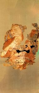 《說法圖》唐 佚名 麻布 設色 縱21.5厘米 橫16.8厘米 德國柏林印度美術館藏 此圖中婆羅門形象很有西域人的裝束,佛陀卻是典型的中國本土程式。畫中線描細麗,人物姿態優美,天衣飄動,是唐代宗教畫的上乘之作。