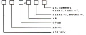 舉例:0.6TWY500×8JB表示:公稱通徑為500mm,工作壓力為0.6MPa(6kg/cm2)波數為8個,不鏽鋼管連線的軸向型外壓式波紋補償器。