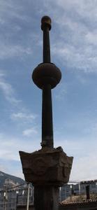 上院村,今天的辛家宅院前矗立著兩根石旗桿,據說門兩側的石鼓上站著一對雌雄石猴,背負幼猴,意代代封侯。能看見門匾上有字:司典成均,這是清道光二十五年朝廷對辛旭貴的褒獎,辛旭貴曾捐助河工、資助軍需千金。這一年,辛旭貴邀請修繕北京紫禁城返回五台山的能工巧匠158名,參與辛家庭院、墳塋、石牌樓、石旗桿的設計建造。當時,辛家有石旗桿8對,木旗桿4對,是聞名晉西北的功名旗桿村。