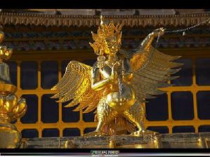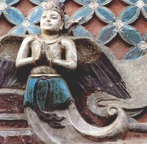 其形象為人首鳥身。在我國,迦陵頻伽的形象最早出現在北魏的石刻上,唐代敦煌壁畫以及銅鏡也多見其造型。巴林左旗遼上京南塔的浮雕迦陵頻伽像,頭梳髮髻,臉型豐腴,額點朱志,上身裸露,作飛翔狀。