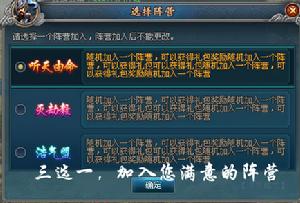 當玩家達到18級之後,系統會自動彈出加入陣營選擇對話(如下圖),玩家可以在兩個陣營中選擇一個自己喜歡的陣營加入,陣營只能加入一次,加入後不得更改。