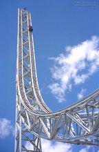 中國的第一部過山車,位於香港海洋公園如果說美國有一個過山車的搖籃,那么它就是紐約的科尼艾蘭。美國的第一部過山車1884年在這裡誕生。對於過山車迷來說,這裡是他們的“麥加聖城”。科尼艾蘭仍保留著1927年建造的最早的木質過山車“颶風號”(Crystal Beach Cyclone)。今天木質過山車產生的神奇效果是在上個世紀20年代所無法想像的。美國辛辛那提市附近的Kings Island遊樂園裡面有一個“Son of Beast”——“野獸之子”木質過山車(有鋼支撐)開創了令人震撼的新高度,它高66米,長2143米,最高時速126公里,上下有65米的落差,造價據估計2000萬美元,能同時供3輛過山車運行,每輛可載36人。它甚至還有一段木質過山車界唯一的垂直循環軌道,這是一個創舉,因為人們曾認為這對木質過山車來說是根本不可能的。不過最終還是因為安全上的考慮(見下)於2006年12月拆除了這段垂直循環軌道。這座過山車也於2012年10月被完全拆除。