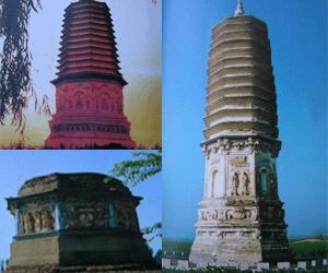 三塔雄姿 其中遼代大明塔建於 1092 年,為八角形十三層密檐式實心磚塔,總高 80.22 米,基座 35.6 米,每面長 14 米,周長 112 米,體積龐大,是我國第三大高塔,也是現今保存最好、體積最大的一座古塔。