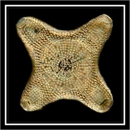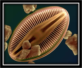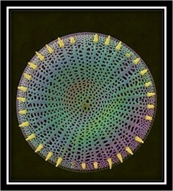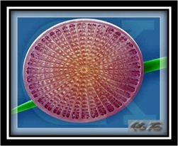 硅藻的名字,來源於它們的細胞壁含有大量的結晶矽。硅藻的細胞壁由SiO2組成,在顯微鏡下,呈纖巧精細的絲網狀,結構極為複雜精密。