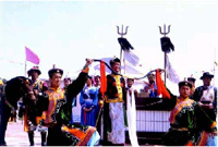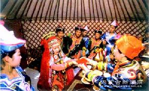 下午申時,新郎家中,賓客盈門,饋贈禮品。主家擺下宴席,請來樂手、歌手,宴請大賓、伴郎、祝頌為首的娶親代表。宴罷,鼓號一響,已近日募。娶親的人們來到祿馬下面,祭過聖主成吉思汗。此時,披弓掛箭的新郎如一位即將出征的勇士被眾人簇擁過來。據傳,戰時娶親,必佩戴弓箭,一為隨時備戰,二怕“搶親”的習俗。新郎翻身上馬,充當司儀的祝頌人端起一碗鮮奶,高聲吟誦《弓箭贊》《駿馬贊》。念了三遍後,一行四人的娶親隊伍策馬向新娘家馳去。