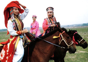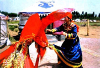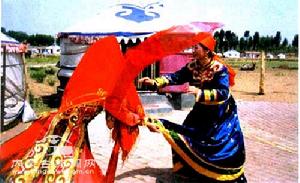 於是,新娘和親人們依依惜別,送行的人們唱起送親歌,歌聲中,伴娘用紅紗為新娘蒙上頭,然後上馬繞自家的蒙古包一周,便策馬向新郎家馳去。一路上,雙方親友相互追逐嬉戲,看誰搶先到達,最後,往往是男方搶先到家。
