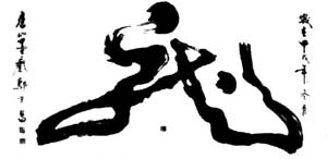 筆者在這裡要特別向讀者推介的是他的另一件作品———他的單字書法作品“龍”。他對漢字“龍”的大膽處理頗具匠心,通過對字形的誇張變形,造成筆勢的動感,又借左半部點畫的欹斜與右半部點畫的相反方面的欹斜、支撐,形成一種張力,對觀眾的視覺給予巨大的衝擊,險絕之感油然而生。杜甫曾有詩句“絕筆長風起纖末,滿堂動色嗟神妙”,用於此處,庶幾近之。值得一提的是鄔榮昌先生對墨的控制非常老到。墨過濃,則運筆礙滯,不利於書寫,尤其是過濃之墨對行草書的書寫是大忌,最易寫出呆滯僵硬的作品;墨過淡,則漫漶不易控制,書寫者只好被迫疾速書寫,易造成點畫飄浮無力。鄔先生顯然胸有成竹,用墨濃淡適度,書寫疾遲合度。將神龍那種飄逸跳躍、駭人驚心的神態表現得淋漓盡致!