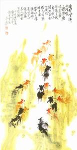 此詩直接描寫畫面景物,春光明媚,惠風和暢,百花爭艷,到處都是萬紫千紅。在陽光照耀下,紫藤枝頭上的麻雀顯得十分活躍,或互相呼叫,或竊竊私語,飛來又飛去。這裡的風景宜人,碧波蕩漾,水草搖曳,令人賞心悅目,更有池塘里的游魚,成群結隊,戲玩追逐。看這些絢麗多彩的金魚,正搖動著長尾,以動人的舞姿,款款向你游來。面對這么美好的圖景,你一定會留連忘返。