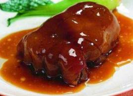 6、鍋內放香油推勻,舀淋熊掌上,花椰菜炒熟,圍於熊掌四周即成。