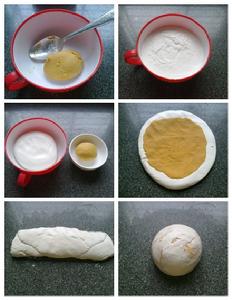4.白糯米糰壓扁,紅薯團壓在上面,也壓扁,捲起來,團成圓。